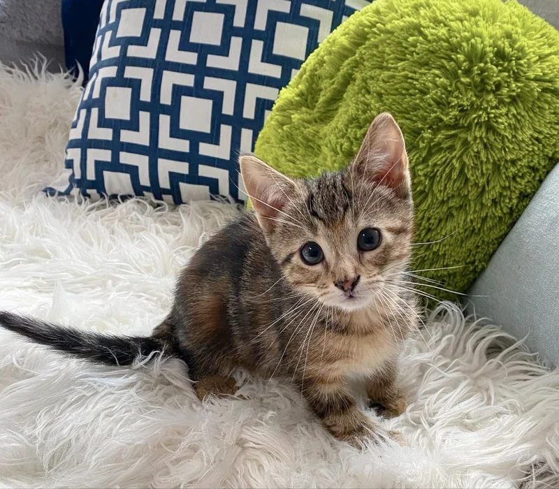 Now, Kickers has fully grown into a lively, affectionate, and curious young cat. She’s known for her mischievous streak and endless energy — always chasing toys, cuddling her siblings, and greeting visitors with her gentle purr. Despite her tough start in life, her joyful personality shines through in everything she does.