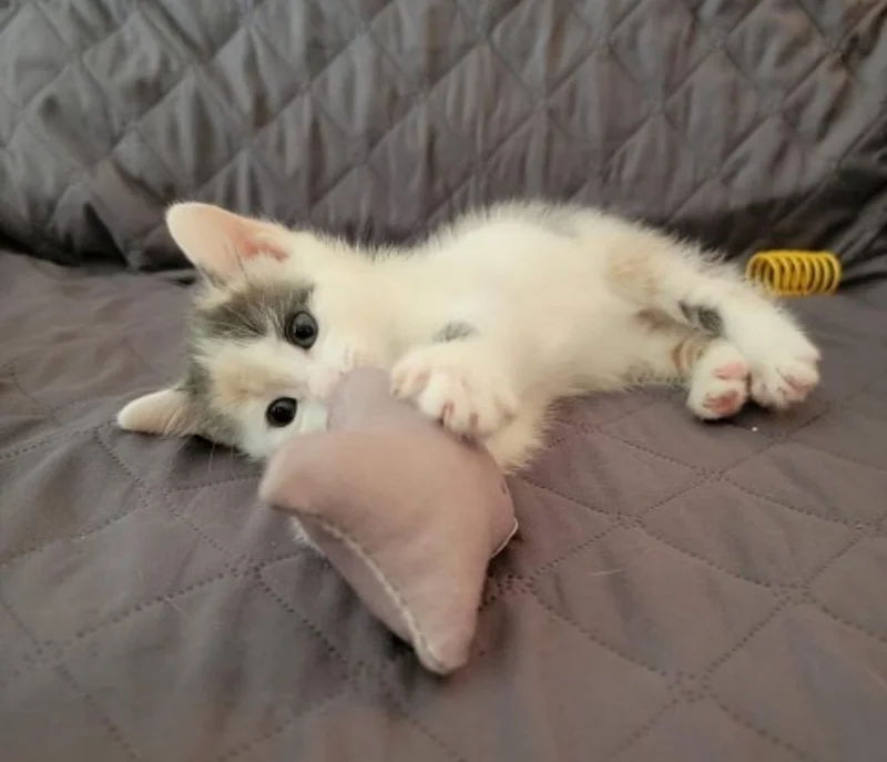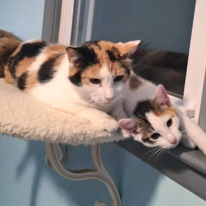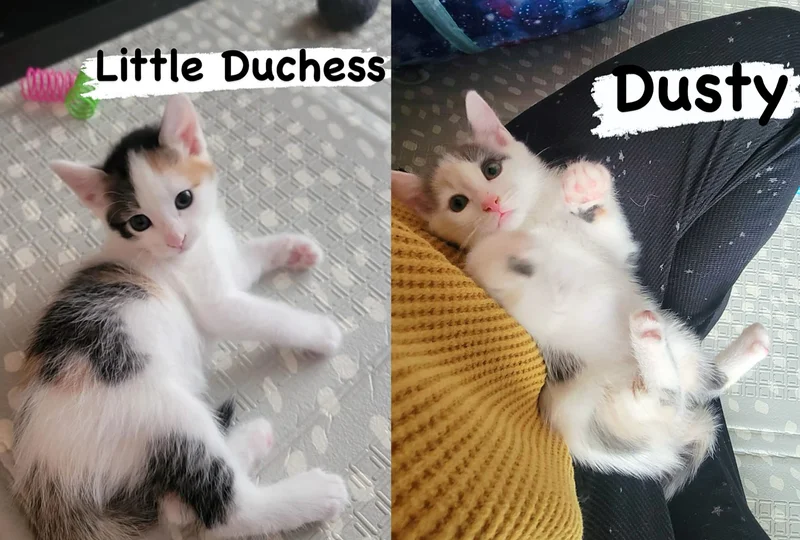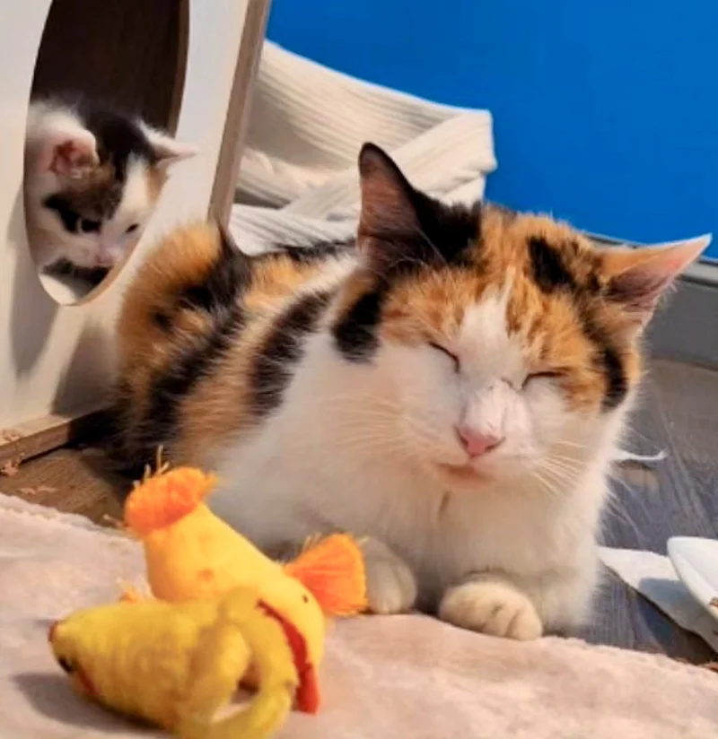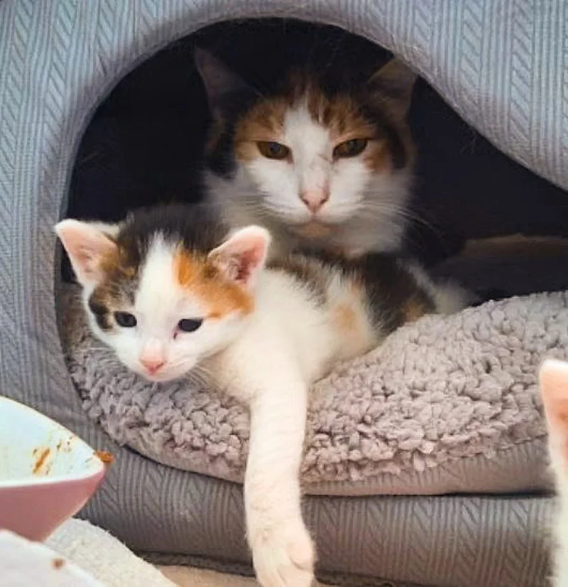 Among the kittens, Dusty stood out as the most playful one — a mischievous little calico who brought energy and joy wherever she went. Despite her wild antics, she was also affectionate and loved to nap in the silliest positions. Little Duchess and Dusty became inseparable, constantly playing, chasing toys, and learning from their brave mother.
