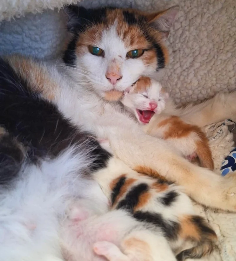 Shortly after being rescued, Duchess went into labor and gave birth to four beautiful kittens — two of them looked exactly like her. It was clear she had spent her entire life outdoors, facing danger and discomfort while caring for litter after litter. Once placed in a safe foster home, Duchess began to experience comfort and care for the first time. “She was probably born on the street and made it this far, which is amazing,” shared Little Wanderers NYC, the rescue organization that saved her.