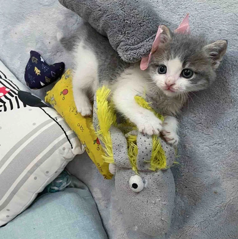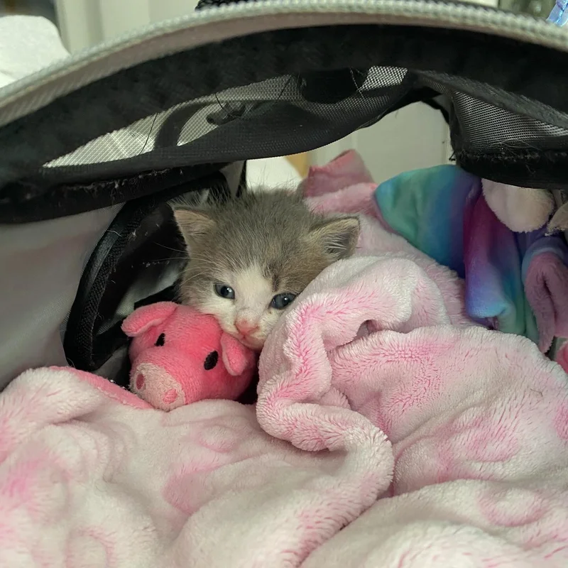To ensure he never missed a meal, his foster mom took him everywhere in his tiny “private chariot.” Whenever his food was even slightly delayed, he would make sure everyone knew it by meowing loudly. Once his tummy was full, Bokbok would curl up with his favorite plush toy — a soft stuffed pig — which became his comfort companion for every nap.