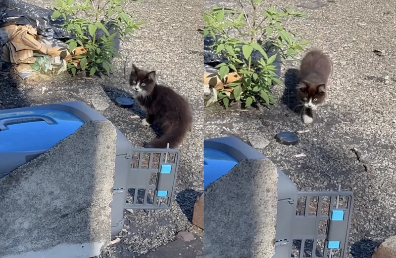 After securing permission, Donna quickly returned to her vehicle to retrieve a humane carrier and some enticing food before ascending the stairs to the rooftop. “Once I got up there, I didn’t see any other kittens, and the mom was nowhere to be found,” Donna recounted. It seemed the resourceful mother cat had decided it was time to move on and entrust her offspring to the kind rescuer. Donna speculated, “She literally brought me her kitten as if to say, ‘I’m done with this kid. Here he is. Take him.’” Donna soon learned that the mother and son had a history; they once had a dedicated caretaker who could no longer provide for them, making their situation precarious. Understanding the urgency of the moment, Donna set the carrier down with a delicious portion of wet food inside. The hungry kitten, who she would later name Johnny, didn’t hesitate, walking right into the safe confines of the carrier within minutes. “I walked over and closed the door. He ate the entire can of wet food,” she added, realizing the kitten was starving.