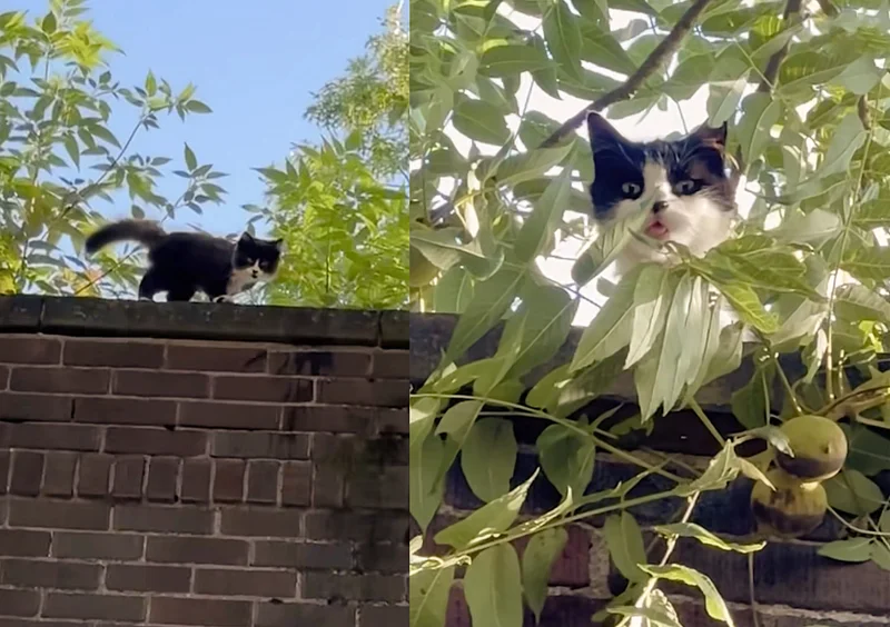 An amazing discovery was made when a kind individual heard a small meow echoing from the rooftop of a building, leading them to a fluffy kitten and his watchful mother—a pair waiting for their chance at a better life. The call was answered by Donna, a dedicated animal rescuer known for her tireless work with community cats. She had just completed her routine morning checks when she heard the unmistakable, urgent sound of a kitten crying out from the very top of a nearby structure. Following the insistent cries, she eventually located a small, fluffy black-and-white kitten pacing back and forth on the rooftop, directing his loud meows right at her. Nearby, his mother was spotted, a cautious figure perched discreetly under some tree branches, peering out. Just as Donna assessed the situation, John, the owner of the property, arrived in the lot. Upon hearing about the mother and kitten in need, he immediately and generously offered Donna access to the roof to facilitate the rescue.