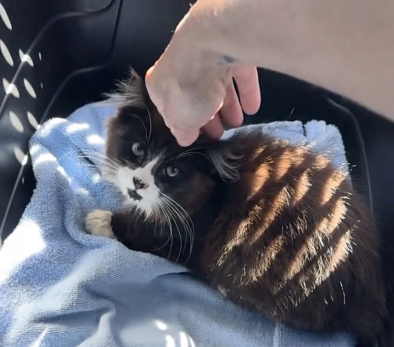 With the little guy secured, Donna promptly transported Johnny to an animal clinic for immediate medical attention. The examination revealed that at just eleven weeks old, he was severely underweight, suffering from dehydration, and was heavily infested with fleas and lice. The compassionate clinic staff immediately initiated treatment, administering fluids and necessary medication to stabilize him. Despite his rough start, Johnny’s innate sweetness shone through; he completely charmed everyone he met. His purr motor was constant, a steady rumble of gratitude that persisted whether he was being held securely in someone’s arms or simply savoring a well-deserved meal.
