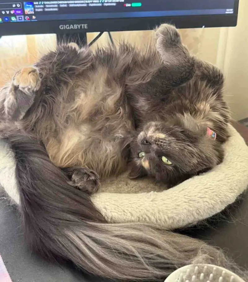 When Daniel opened the carrier, Rehan stepped right inside — as if she already knew she was going home. She was soon renamed Reyna, growing into a gorgeous cat with a soft, silky coat and a queen-like personality. She quickly claimed her favorite spot near the computer, often “supervising” her humans at work — though her naps on the job are just as frequent.