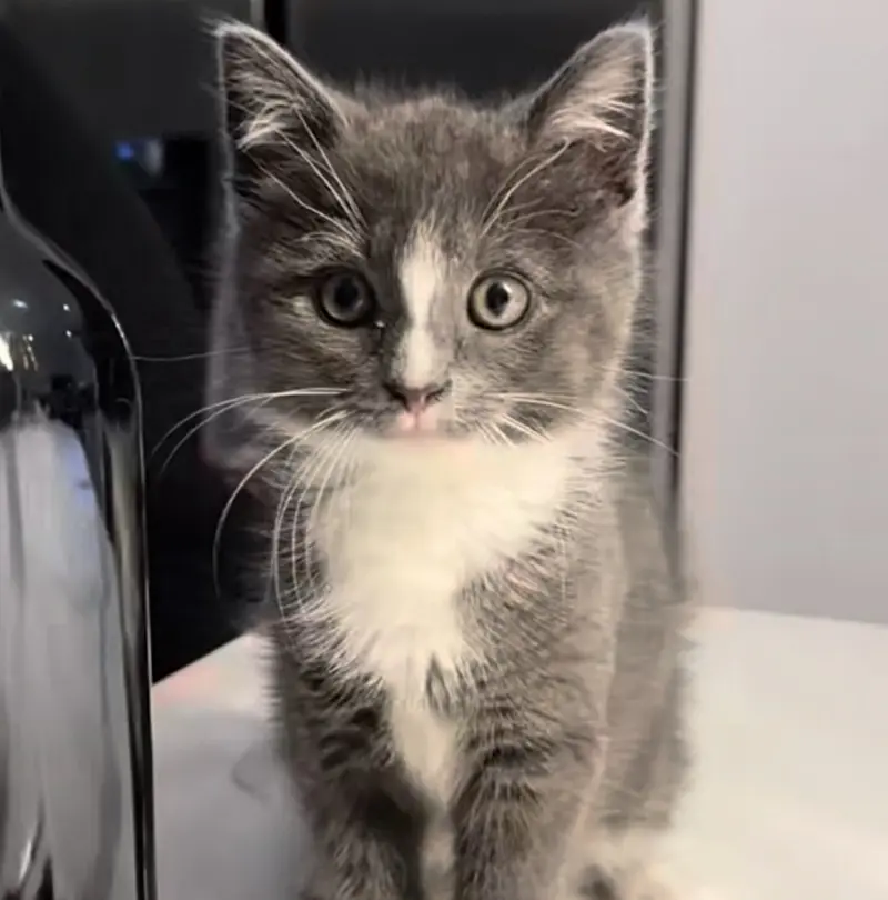 One evening last month, while Patrycja was near her car, she suddenly heard faint cries echoing through the quiet street. The sound was soft but persistent, and it immediately stirred her instincts. She knew it had to be an animal in distress. When she crouched down and looked carefully beneath her car, she was astonished to see a small gray and white kitten huddled in fear, his tiny body tucked close to the undercarriage for warmth and safety.